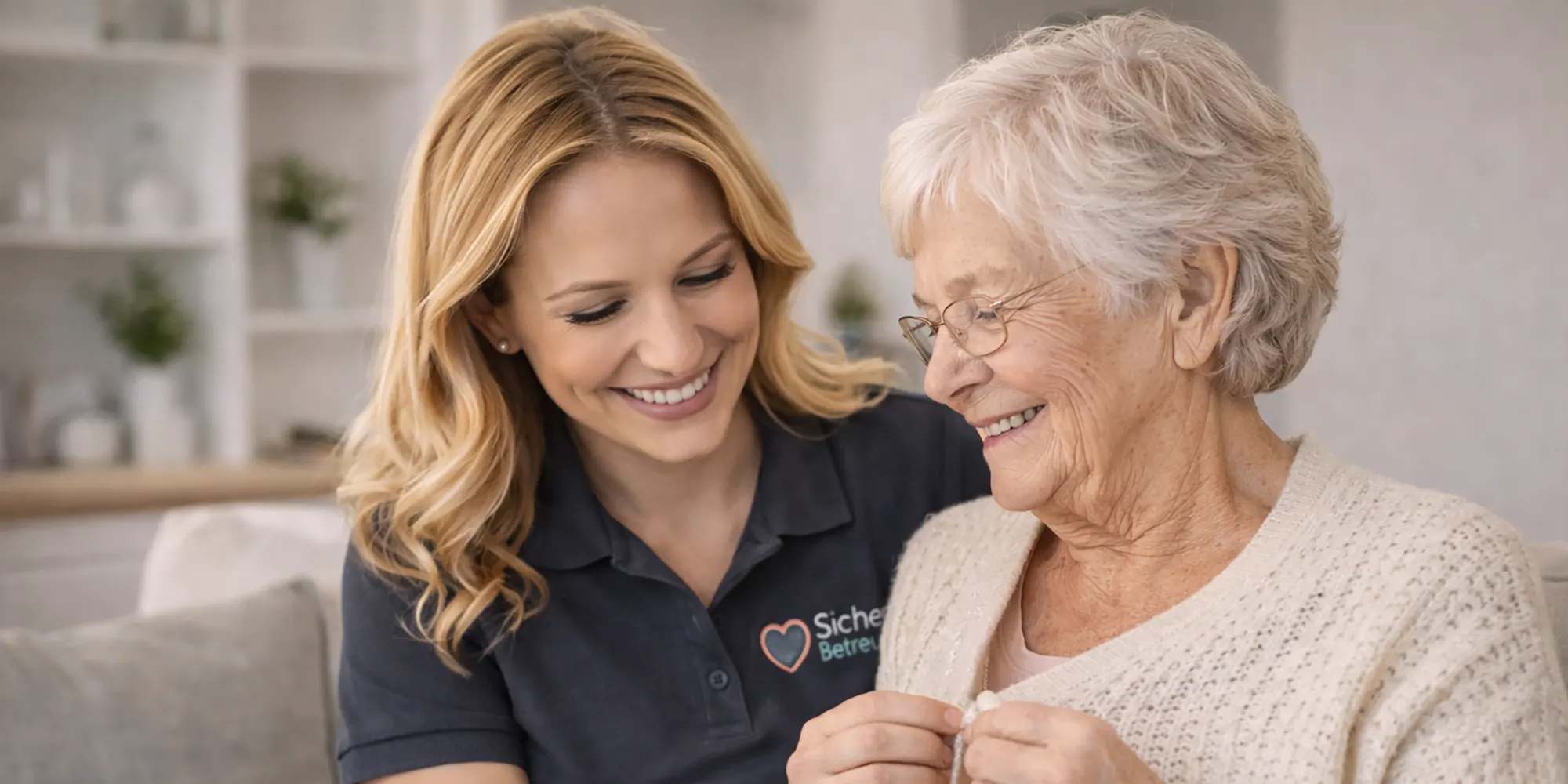 Betreuungskraft unterstützt Senior im Alltag sicher und zuverlässig